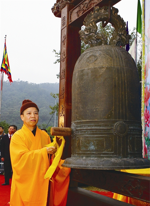 | Le bonze supérieur Thich Thanh Quyêt, gérant de la pagode de Yên Tu, frappe la cloche, inaugurant la fête de Yên Tu. |