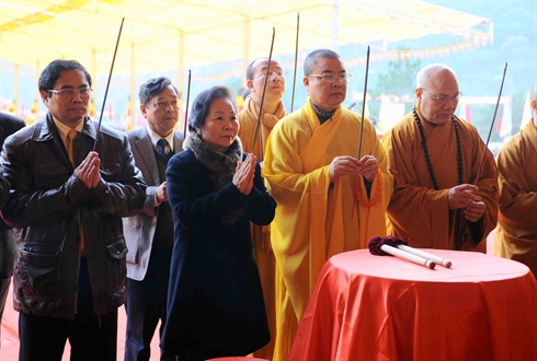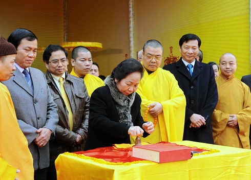 | La vice-présidente de la République, Nguyên Thi Doan, inaugure le rite d’apposition du cachet qui marque l’ouverture officielle de la fête de Yên Tu. |