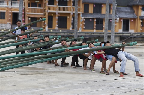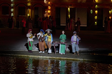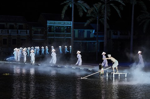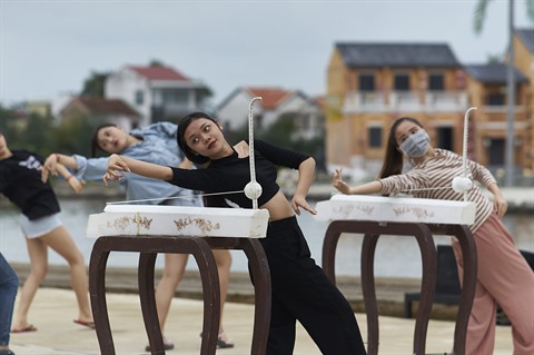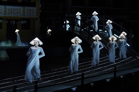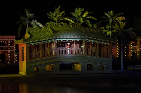 | Danse des áo dài - la tunique traditionnelle vietnamienne - à l'intérieur de la pagode Câu - le monument symbolique de Hôi An |