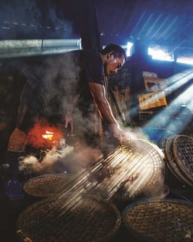 | Cuisson de poissons à la vapeur avant leur mise en vente, à Quy Nhon, province