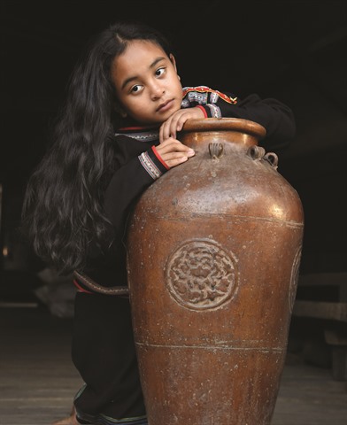 | Une fillette Ê dê à côté d’une jarre de ruou cân. |