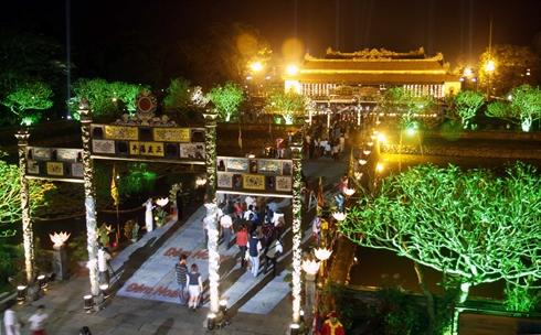 Les étendards, lanternes et parasols ornent les rues de la Porte du Midi (Ngo Môn) à la Cité pourpre interdite. Les bougies brillent sur le pont Trung Dao (pont de la Voie du Milieu) qui mène au Palais Thai Hoà (Palais de la Paix suprême), et une musique harmonieuse, conduisent les touristes à la Cour Dai Triêu Nghi (Esplanade des Grandes salutations) où a lieu un défilé en costume traditionnel de plusieurs pays d'Asie tels que le Japon, la République de Corée, la Mongolie, l'Inde, la Thaïlande, le Cambodge, les Philippines et le Vietnam.