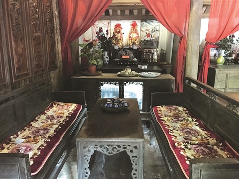 Elle possède cinq travées et 30 colonnes réparties en cinq lignes posées sur des socles de pierre bleue, assurant ainsi sa solidité. Sa travée centrale, à la superficie la plus grande, est ornée de sentences parallèles, de panneaux transversaux, et abrite l’autel des ancêtres.