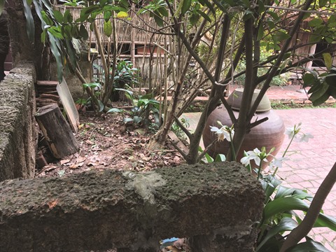 | Un coin de la cour et une jarre destinée à collecter l’eau de pluie. |
