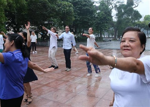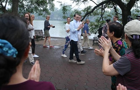 | Le couple royal fait de la gymnastique avec les Hanoïens. Photo: VNA/CVN |