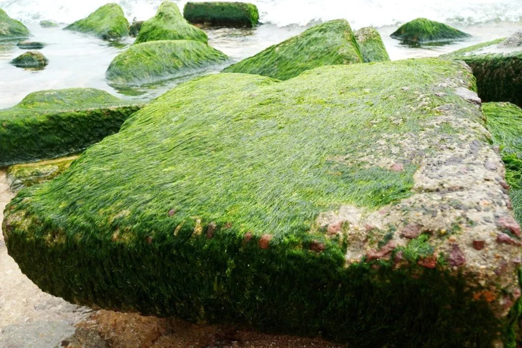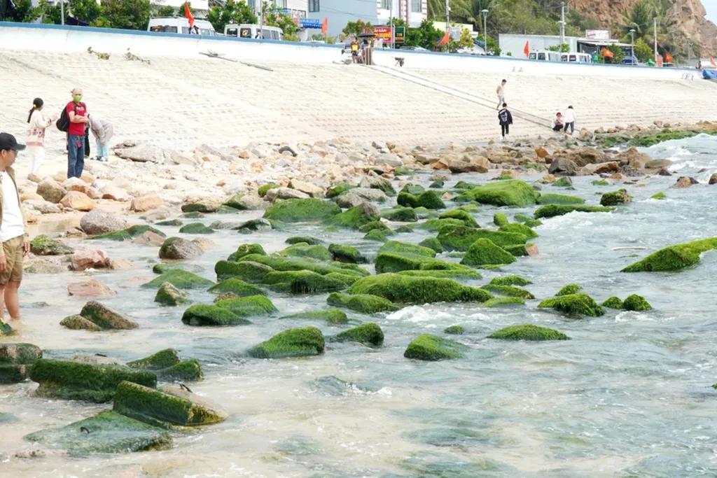 Ces derniers jours, de nombreux visiteurs affluent vers le village de pêcheurs de Nhon Hai, commune de Nhon Hai, sur la pittoresque péninsule de Phuong Mai, à environ 10 km au nord de Quy Nhon, province de Binh Dinh. Ils sont attirés par un spectacle naturel unique et éphémère : lorsque la marée se retire, les rochers le long du littoral se dévoilent, se parant d'un manteau d'algues vertes éclatantes. Ce phénomène, qui se produit lors des marées basses, offre un paysage saisissant et photogénique.
