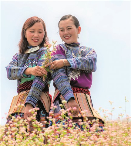 Les costumes traditionnels des femmes H’mông fleurs sont de vraies œuvres d’art décoratives. Ils sont composés d’un foulard, d’un chemisier, d’une jupe plissée et d’une longue ceinture. En particulier, les vêtements de brocatelle de cette ethnie font forte impression grâce à l’éclat des couleurs rouge et bleu foncé juxtaposées.