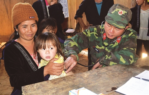 | Un médecin militaire de la Brigade 741 ausculte gratuitement des enfants. |