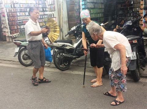 | Soucieux de la santé de sa mère de 92 ans, M.Trung, domicilié rue Hàng Giây, arrondissement de Hoàn Kiêm (Hanoï), doit l’amener dehors à la tombée du jour. Photo: Lâm Khanh/VNA/CVN |