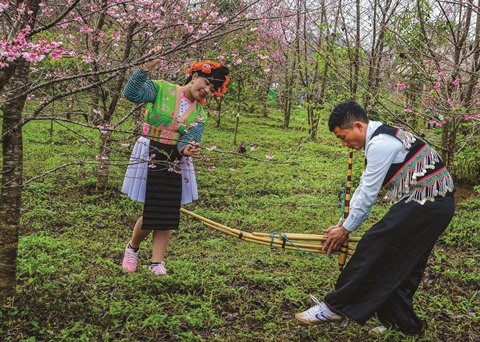 | Avec quatre tronçons de bambou servant de piliers et la pièce tressée, un autel est formé sur lequel seront déposées des offrandes. |