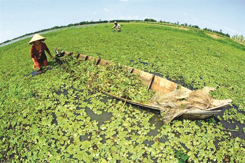 | Un coin de rizière immergée et recouverte par des laitues d’eau à Phung Hiêp (province de Hâu Giang). |