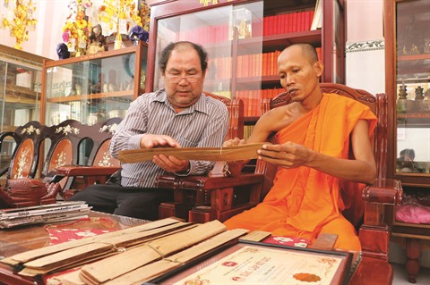 | Le bonze supérieur Chau Soc Pholly a conservé le plus grand kinh la buông du Vietnam regroupant 120 tomes. |
