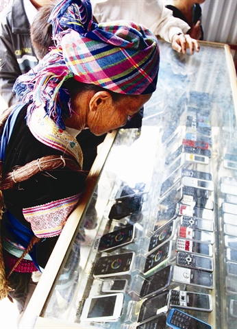 | Une femme de l’ethnie H’Mông en admiration devant des téléphones portables. |