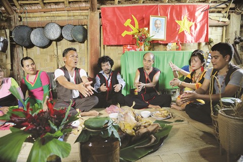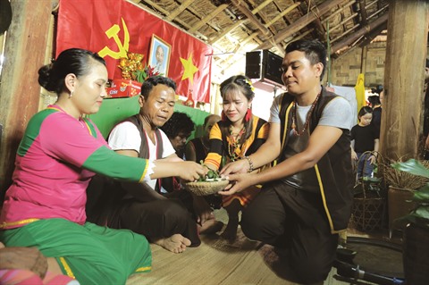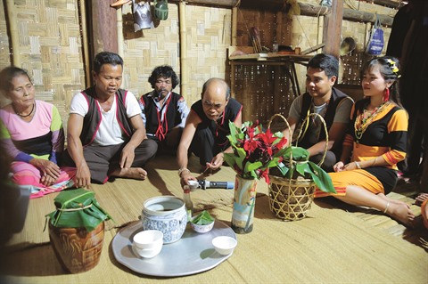 | La mariée et le marié (droite) invitent les membres des deux familles à consommer une chique de bétel. |