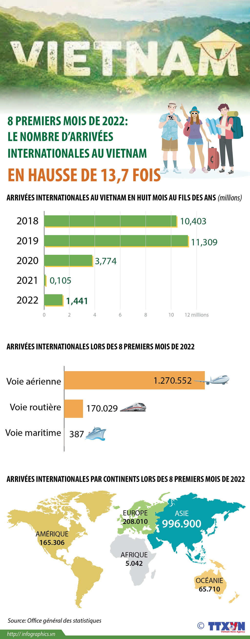 Entre janvier et août, le nombre d’arrivées internationales au Vietnam a atteint plus de 1,44 million, soit 13,7 fois plus que le niveau enregistré à la même période de l’an dernier.
