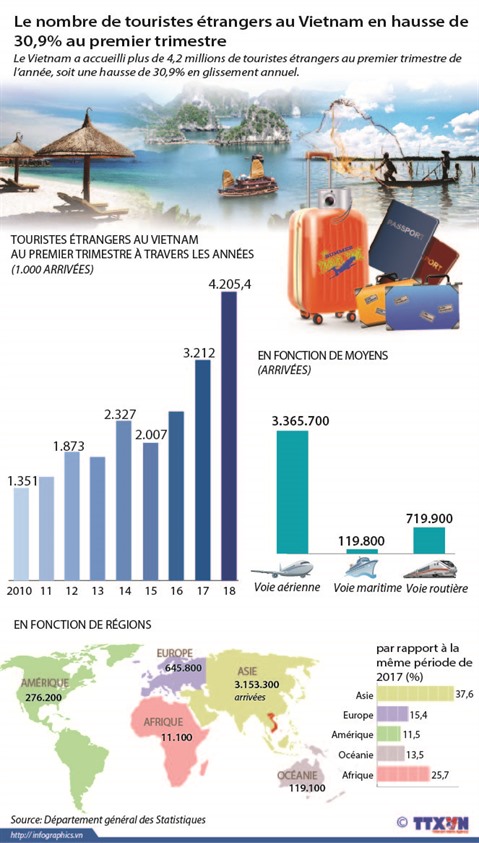 Le Vietnam a accueilli plus de 4,2 millions de touristes étrangers au premier trimestre de l’année, soit une hausse de 30,9% en glissement annuel.
