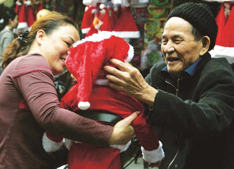 | Un grand-père visiblement enchanté d’acheter la tenue du Père Noël à son petit-fils. Photo : Quy Trung/VNA/CVN |