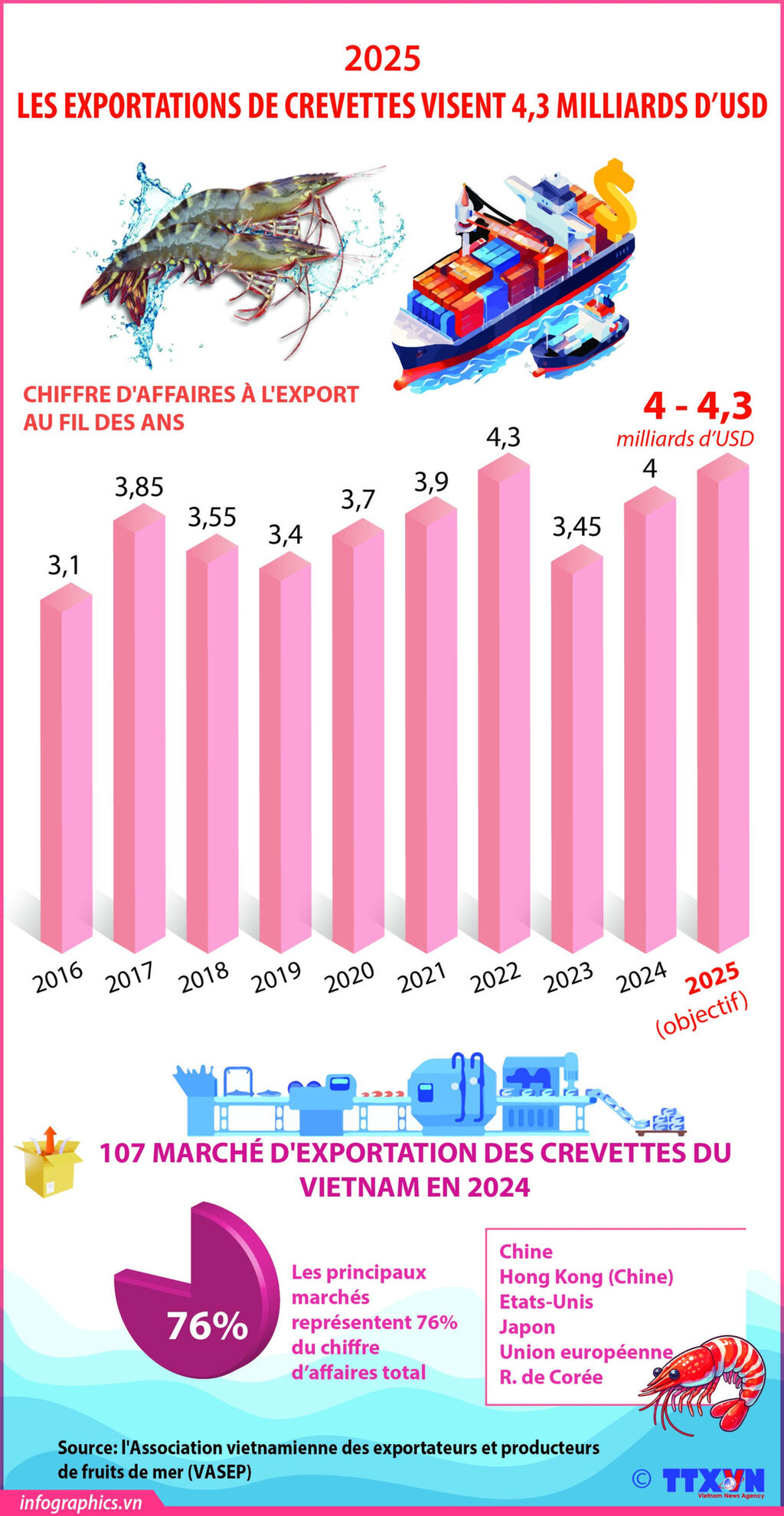 Selon l'Association vietnamienne des exportateurs et producteurs de fruits de mer (VASEP), les exportations de crevettes du Vietnam en 2025 devraient atteindre 4 à 4,3 milliards de dollars.