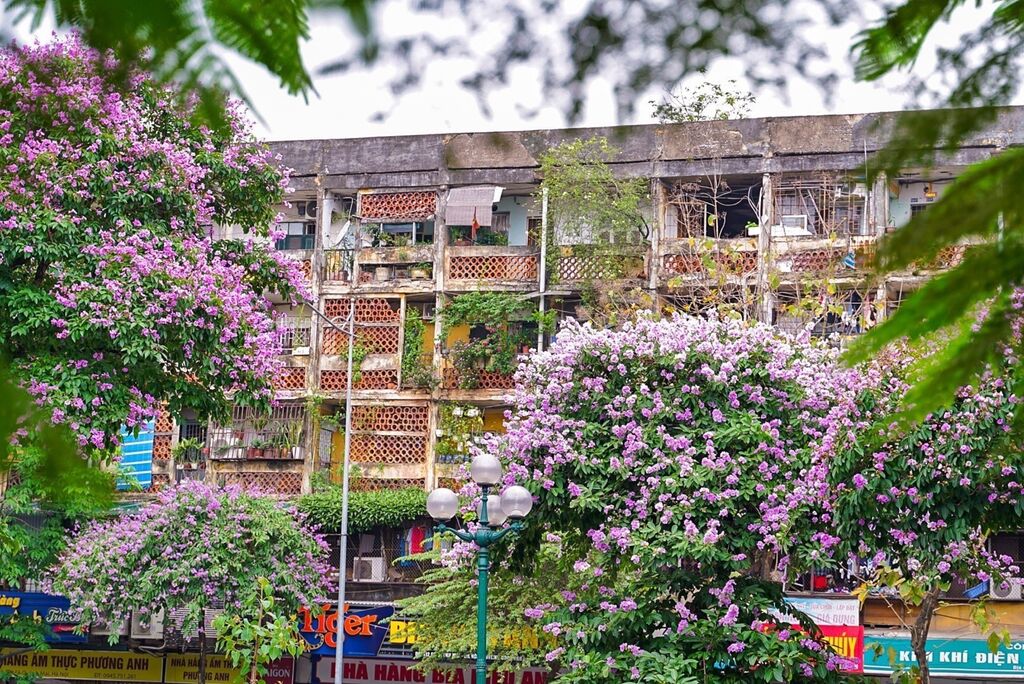 | Les fleurs de "bang lang" s'épanouissent devant un immeuble ancien. |
