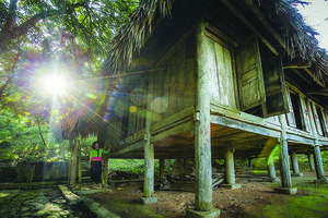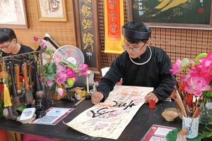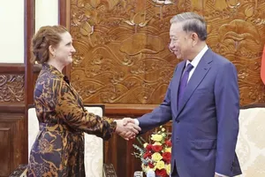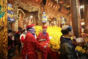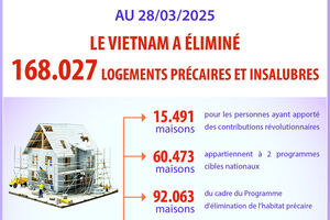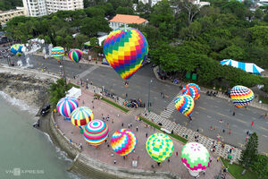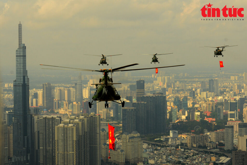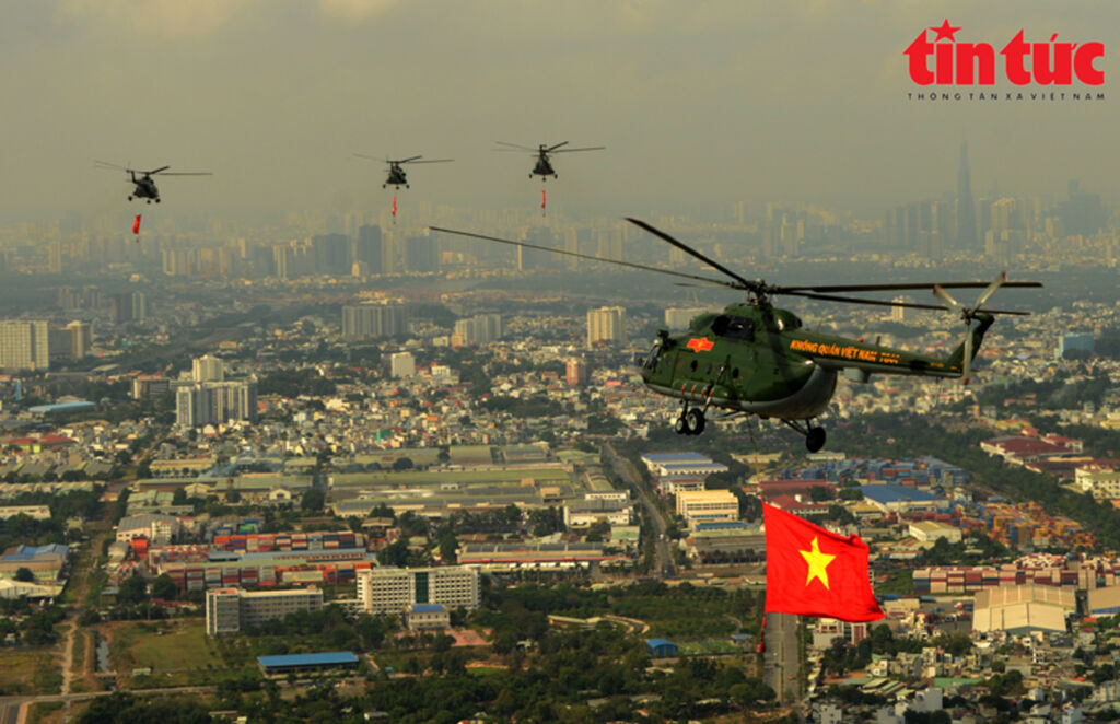 | Des drapeaux rouges à étoile jaunes flottent au-dessus de Hô Chi Minh-Ville alors que des hélicoptères répètent pour le grand défilé. |