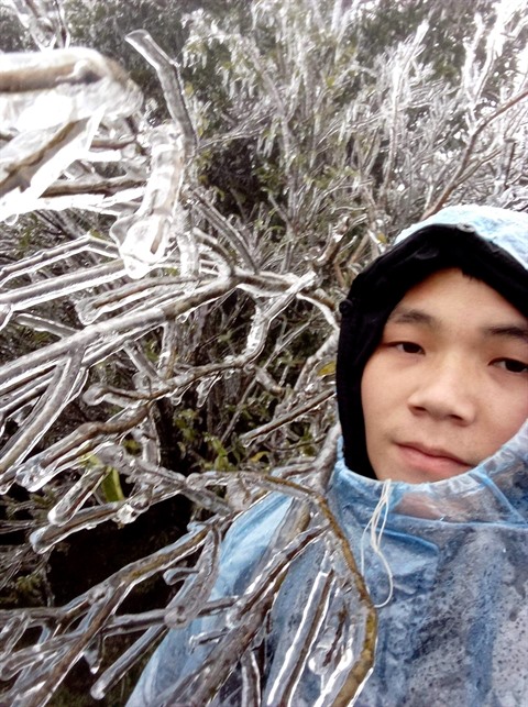 | Un habitant prend des images de plantations couvertes de givre au sommet de Cao Ly, dans le district de Binh Liêu, province de Quang Ninh (Nord-Est). |