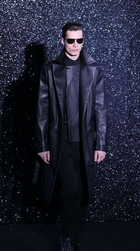 L'épaule de ces hommes hyper virils est arrondie, jamais rembourrée, offrant une ampleur flatteuse à la carrure. Beaucoup de faux noirs dans cette collection axée sur le soir, où le cuir est travaillé pour avoir l'air quasiment faux et les matières naturelles plastifiées pour jouer le contraste des textures.