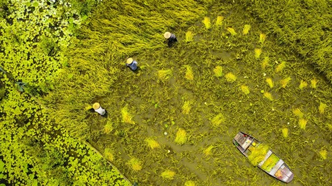 | Vue aérienne d’une rizière en train d’être moissonnée. |