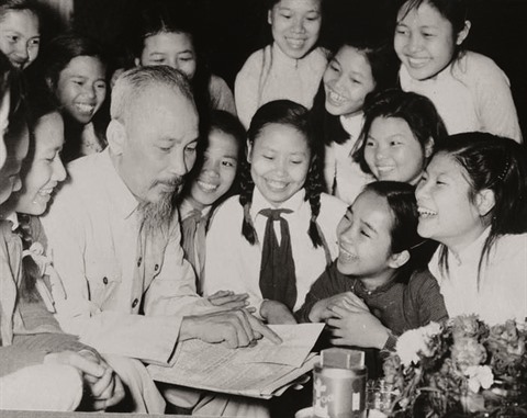 | L’Oncle Hô et les élèves du lycée Trung Vuong, à Hanoï, lors du 66e anniversaire du Président, le 19 mai 1956. |