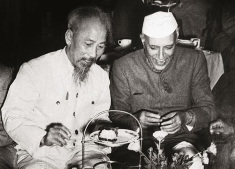 | Le Président Hô Chi Minh et le Premier ministre indien Jawaharlal Nehru, lors de sa visite en Inde du 5 au 14 février 1958. |