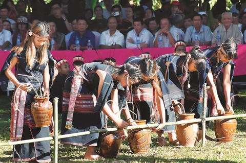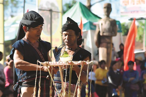 | Le patriarche et les chamans effectuent des rites dans la nhà rông. |