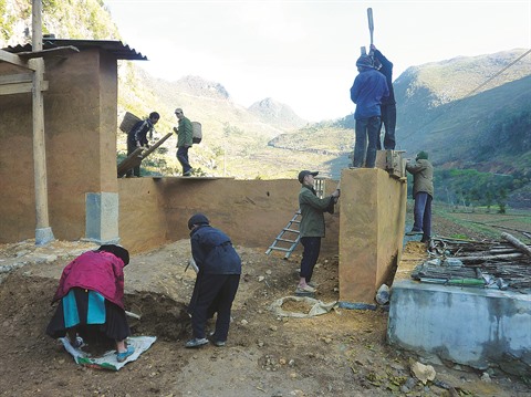 Après avoir choisi l’emplacement idéal pour la construction de la maison, les H’mông utilisent un moule en bois dans lequel ils pressent de l’argile pour en faire des blocs. À partir de ces blocs sont construits les solides murs de l’habitation. Des maisons de deux étages sont également construites, avec des fondations à base de blocs de pierres. La particularité de ces maisons est qu’elles restent chaudes en hiver et fraîches en été.