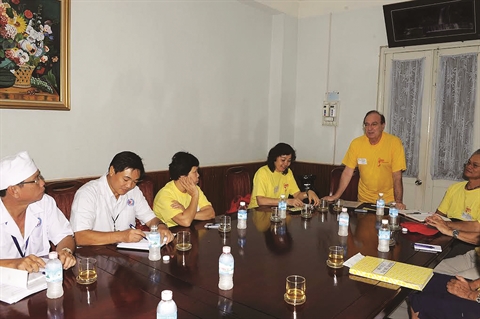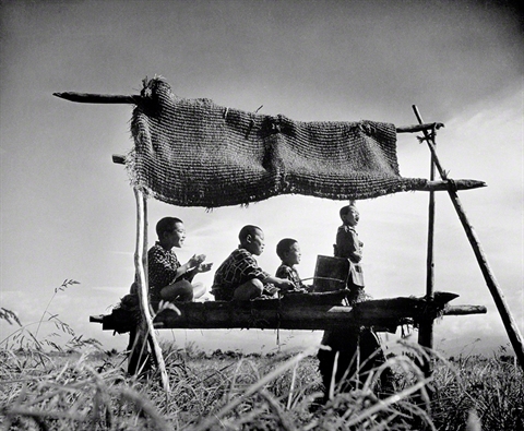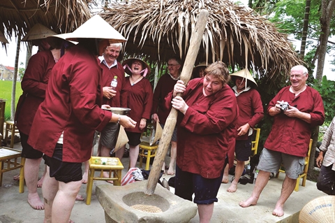 | Des touristes étrangers enchantés de revêtir l’ao bà ba des paysans. Photo : Trân Tinh/VNA/CVN |