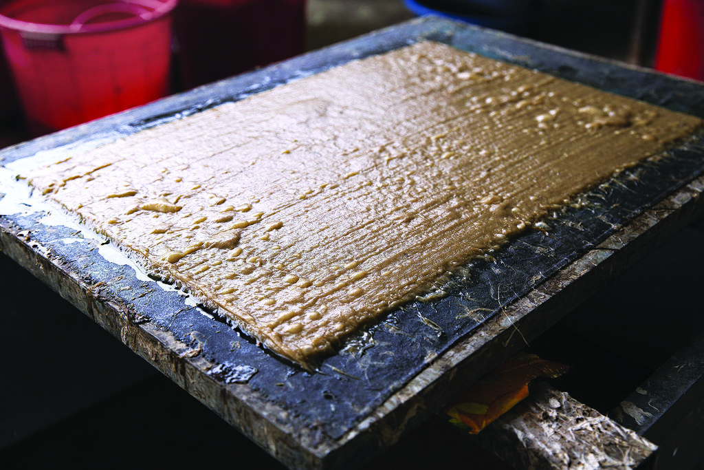 | L’écorce du Rhamnoneuron balansae est cuit pendant plus de dix heures avant d’être broyé en poudre pour fabriquer du papier dó. |