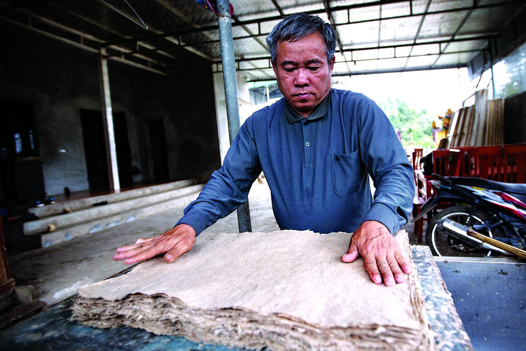 Selon lui, le processus de production du papier dó est très compliqué, passe par 35 étapes et dure 15 jours. Les plantes utilisées sont dó et duong (Broussonetia papyrifera).