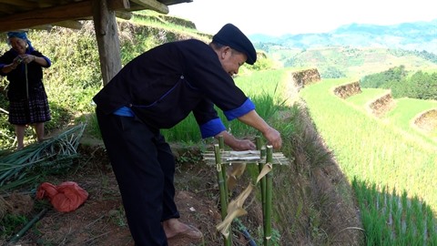 | Pour préparer un “autel” en plein air, le propriétaire tresse des lattes de bambou pour former une pièce d’environ 20-30 cm de large. |