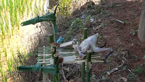 | Avec quatre tronçons de bambou servant de piliers et la pièce tressée, un autel est formé sur lequel seront déposées des offrandes. |