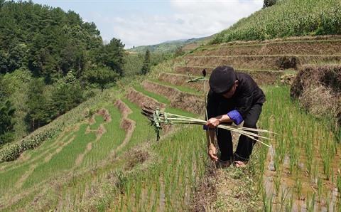 | Ensuite, on plante des tiges sur les berges du champ dans l’espoir que le riz poussera bien. |