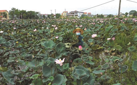 | Récolte de fleurs de lotus dans la commune de Dai Dông, district de Thach Thât. |