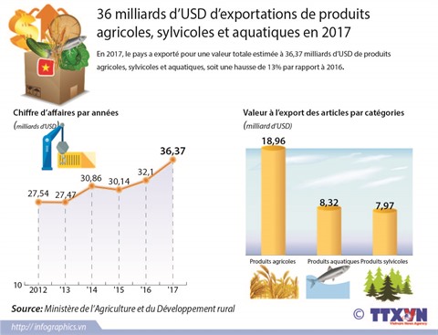 En 2017, le pays a exporté pour une valeur totale estimée à 36,37 milliards d’USD de produits agricoles, sylvicoles et aquatiques, soit une hausse de 13% par rapport à 2016.