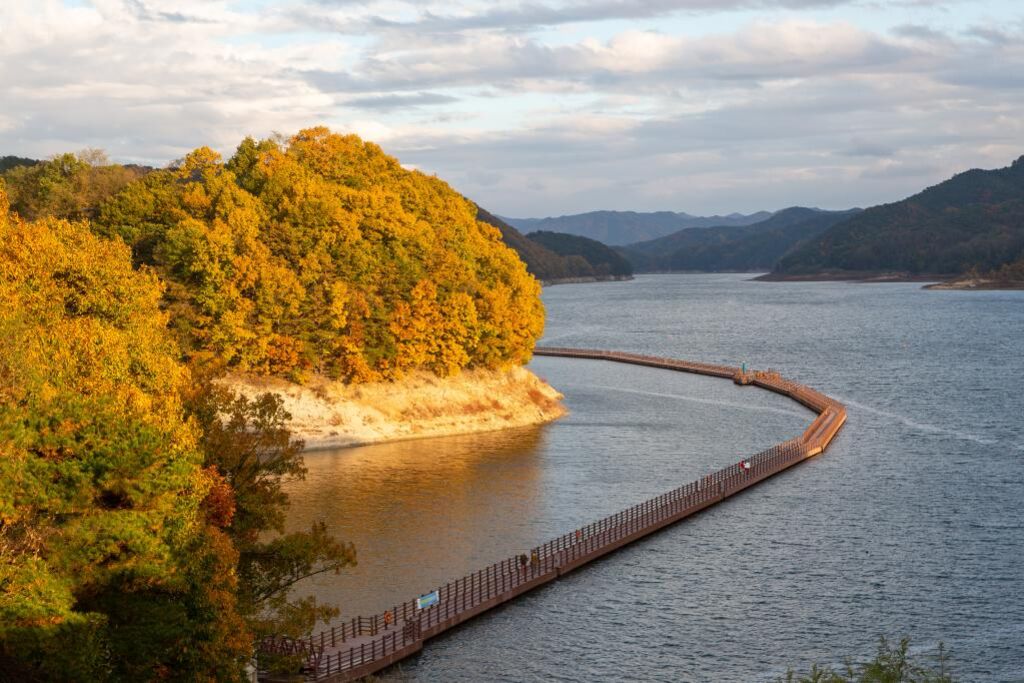 Des touristes profitent du paysage automnal à Andong, dans la province de Gyeongsang du Nord, en République de Corée, le 28 octobre 2022.