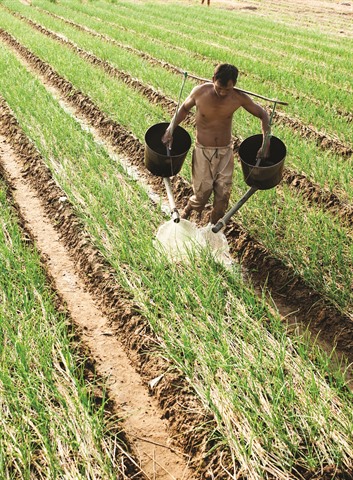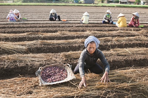 | Femmes khmères couvrant de paille les cultures d’oignons violets. |