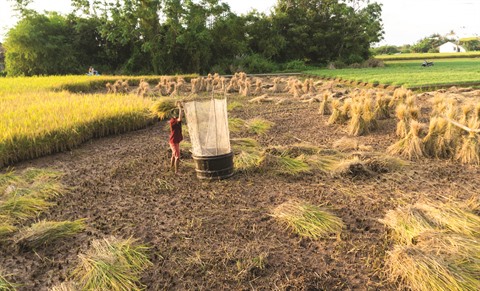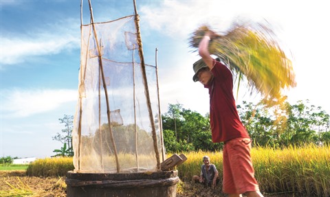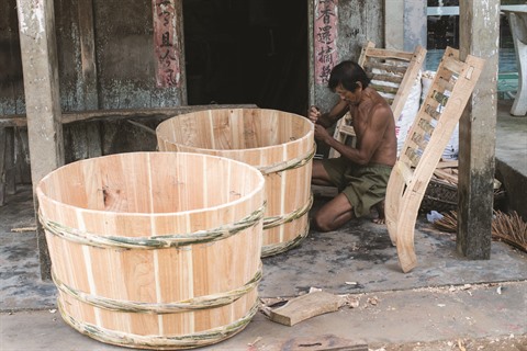| Fabrication par un artisan d’ethnie Hoa de tonneaux en bois pour le battage du riz. |