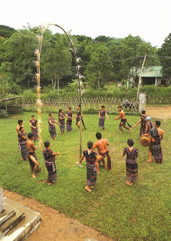 | Les participants dansent et s’amusent autour de la cây nêu (perche rituelle) érigée devant la porte de la maison. |