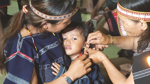 | La sage-femme exécute le rituel en perçant l’oreille de l’enfant. |