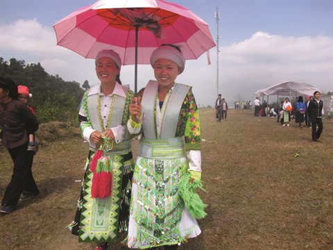| Deux jeunes femmes H’mông en tenue traditionnelle. |