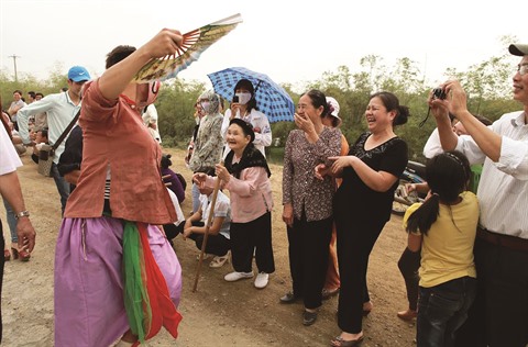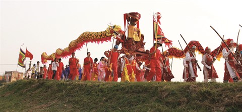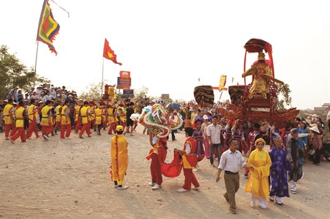 Des porteurs de drapeaux, des musiciens et d’autres participants arborant des armes traditionnelles complètent la procession. Sur 4 km, elle passe par huit villages, où les habitants la rejoignent au fur et à mesure. Une autre cérémonie s’ensuit, où l’on puise de l’eau dans le fleuve Rouge en guise d’offrande au Génie Chu Dông Tu pour lui demander une météo clémente et de bonnes récoltes pour toute l’année. Ce rite ancestral est confié à un homme âgé du village, connu pour sa droiture et sa générosité.