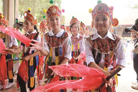 | Des enfants en tenue traditionnelle interprètent la danse de SênhTiên. |