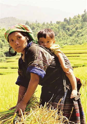 | Une femme travaillant aux champs portant son enfant sur le dos. |