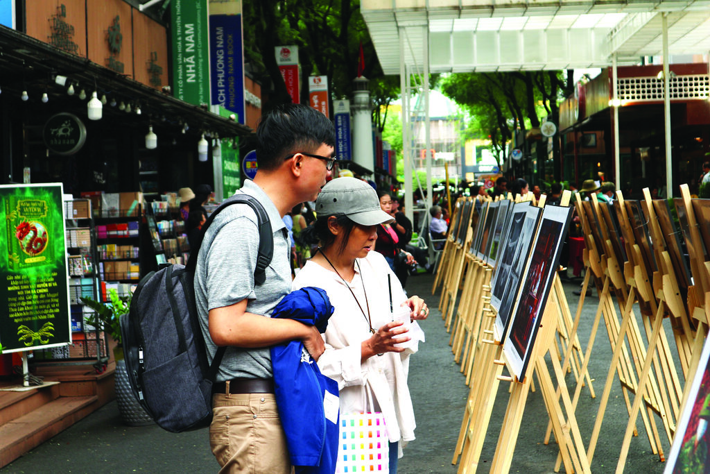 | Des visiteurs à une exposition de photos sur la lutte contrele COVID-19 à Hô Chi Minh-Ville. |