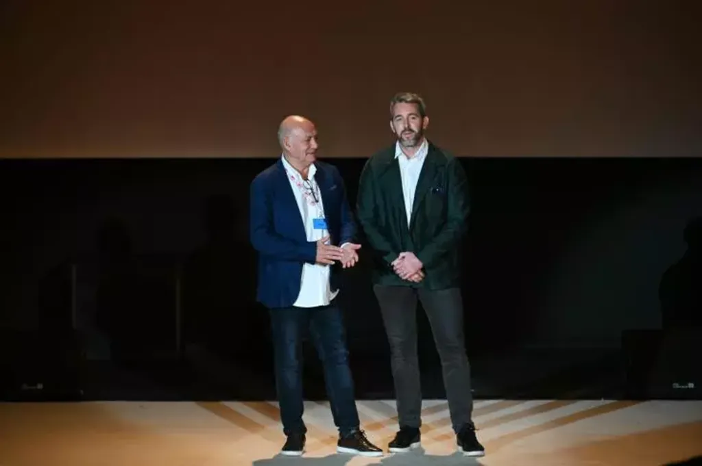 | Le photographe français Pascal Maitre et le lauréat du Visa d’or news 2025, le photographe irlandais Ivor Prickett, sur la scène du festival Visa pour l'image, à Perpignan, le 6 septembre. |